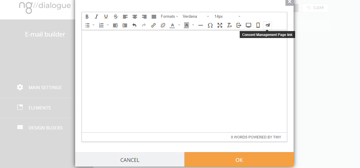 To add a CMP link to an email campaign, you can open Email Builder and edit the text: