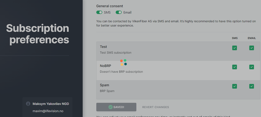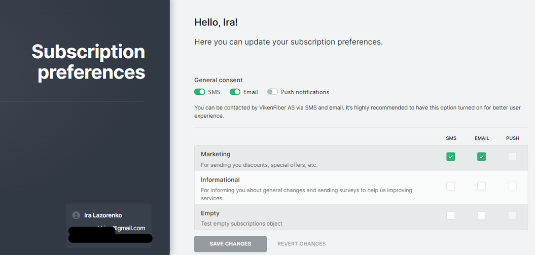 Consent - consent to receive messages of various types through predefined communication channels (SMS, Email).