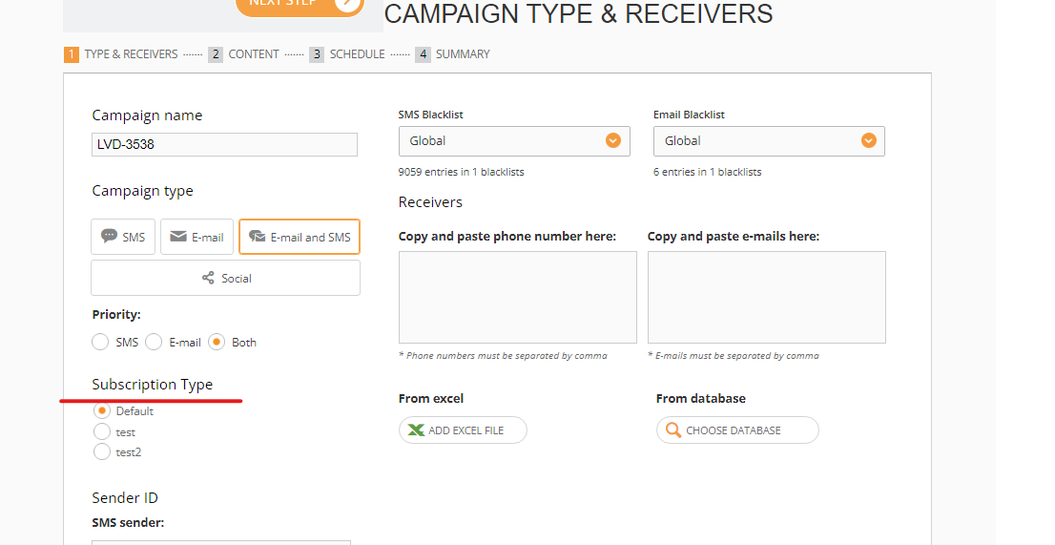 In step 1 of the campaign wizard, we have the Subscription types, for example: